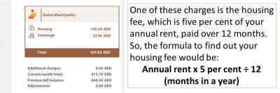 • Monthly Housing Fee = 500 / 12 ≈ AED 41.66